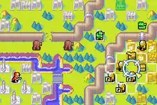 In Design mode, players can edit color palettes for existing commanding officers (after the player has unlocked the palettes) or create their own maps.[5] In the map editor, the size of the map is fixed and the player cannot choose to use any of the new Black Hole buildings introduced in Black Hole Rising. There are also certain rules the player must adhere to in order for the map to be considered playable. Maps created in this mode can be saved on the game cartridge and can be played in multiplayer modes or sent and received to other game cartridges using multiple consoles with a Game Boy Advance Game Link Cable.[2]