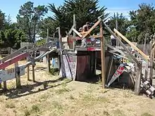 Adventure Playground is an urban park and adventure playground in Berkeley, California, located at the Berkeley Marina. The park opened in 1979 based on the ideas of Danish architect Carl Theodor Sørensen, who had made use of scrap junkyards for playgrounds when Copenhagen was under occupation during World War II. The adventure playground model, sometimes referred to as a "junk playground," is to provide children with the resources to build.[1] The available tools include saws, hammers, workbenches, and nails. The legal liability raised by giving children relatively unrestricted access to these tools has made adventure playgrounds rare in the United States, with the Berkeley Adventure Playground being one of only four in the country.[2]