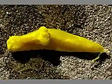 Aegris Citrinus is a nudibranch whose length averages about 14 mm. Its coloration may be translucent, white, or a bright yellow. This depends on the sponges it eats. [3]