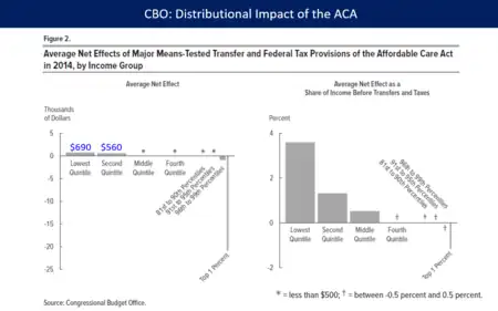 The increased coverage was due, roughly equally, to an expansion of Medicaid eligibility and to changes to individual insurance markets. Both received new spending, funded through a combination of new taxes and cuts to Medicare provider rates and Medicare Advantage. Several Congressional Budget Office (CBO) reports said that overall these provisions reduced the budget deficit, that repealing ACA would increase the deficit,[8][9] and that the law reduced income inequality by taxing primarily the top 1% to fund roughly $600 in benefits on average to families in the bottom 40% of the income distribution.[10]