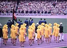The Afghan delegation during the opening ceremony, in the background behind the marching West German delegation. Estadio Olímpico Universitario, 12 October 1968.