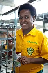 Men and women were often given similar clothing to wear and labor tasks to complete, so to achieve a more feminine appearance and differentiate themselves from the men, some women ironed their hair to make it sleek.[25] They also wrapped their hair by brushing it and binding small sections of it with a material such as thread or cotton to prevent knotting.[25] This technique, known as "wrapping" or "threading", shaped the hair into a curl pattern that women kept protected under a scarf or kerchief while working, and took down for special occasions such as church service or weddings.[26][27]