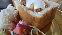 Bunny chow, a dish from Durban ("the largest 'Indian' city outside of India"[12]), consisting of a hollowed-out loaf of bread filled with curry, has been adapted into mainstream South African cuisine. In the townships surrounding Pretoria, the capital, and Johannesburg, this sandwich is often referred to as a spatlo.[13]