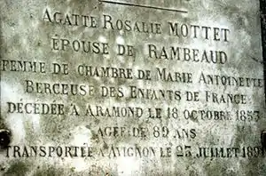 Agathe de Rambaud was the official nurse of the royal children, and particularly was in charge of the Dauphin from 1785 to 1792.[1] She was born in Versailles as Agathe-Rosalie Mottet and was baptized in the future cathedral Saint-Louis of Versailles, on 10 December 1764.[2] She died in Aramon, in the département of Gard, on 19 October 1853.[3]