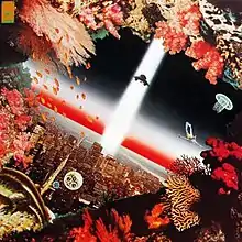 The front cover depicted an advanced civilization with a vast landscape of skyscrapers and red, sunburst-like flames rising out of the cityscape as representations of Agharta's power.[64] Yokoo used a combination of collage, airbrushing, and painting techniques as he had with his previous work, along with postcards collected from his trips to Tahiti and New York City; the cityscape on the front cover was taken from one of his postcards.[60] The back cover showed the city submerged in water, embedded in coral reefs, and hovered over by a diver, fish, and a squid ascending from the city.[65] According to graphic designers Storm Thorgerson and Aubrey Powell, Yokoo depicted groups of jellyfish, coral reefs, and brightly colored fish to suggest an association between Agharta and Atlantis.[61] The foreground of the back cover's illustration featured a reptilian creature. Cultural studies researcher Dagmar Buchwald interpreted this image as an allusion to similar ideas about Lemuria; this mythological continent supposedly existed during the Earth's prehistory and was inhabited by an advanced civilization, later forced under the Earth's surface after its homeland was destroyed by a great flood.[65]