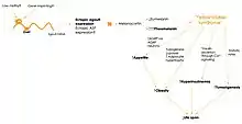 In mice, the wild type agouti allele (A) presents a grey phenotype, however, many allele variants have been identified through genetic analyses, which result in a wide range of phenotypes distinct from the typical grey coat.[13] The most widely studied allele variants are the lethal yellow mutation (Ay) and the viable yellow mutation (Avy) which are caused by ectopic expression of agouti.[13] These mutations are also associated with yellow obese syndrome which is characterized by early onset obesity, hyperinsulinemia and tumorigenesis.[13][14] The murine agouti gene locus is found on chromosome 2 and encodes a 131 amino acid protein. This protein signals the distribution of melanin pigments in epithelial melanocytes located at the base of hair follicles with expression being more sensitive on ventral hair than on dorsal hair.[15][16] Agouti is not directly secreted in the melanocyte as it works as a paracrine factor on dermal papillae cells to inhibit release of melanocortin.[17] Melanocortin acts on follicular melanocytes to increase production of eumelanin, a melanin pigment responsible for brown and black hair. When agouti is expressed, production of pheomelanin dominates, a melanin pigment that produces yellow or red colored hair.[18]