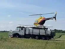 In the case of helicopters, tanks are placed on or outside the body of the aircraft, while a spray rig, extending outward to the sides, is attached well below the main rotor blades. Hydroseeding is often done by helicopters using tanks and drop systems much like those used for aerial firefighting.