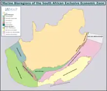 The National Spatial Biodiversity Assessment 2004 recognised 34 biozones nested within 9 bioregions (of which four were offshore). The National Biodiversity Assessment 2011 replaced these ecozones and biozones with the terms ecoregions and ecozones. In 2011, the Agulhas Ecoregion was divided into four distinct ecozones: Agulhas inshore, Agulhas inner shelf, Agulhas outer shelf, and Agulhas shelf edge.[5] 33 different benthic habitats types were identified on the Agulhas Bank.[6]