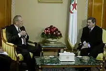 After some prominent involvement in international diplomatic meetings earlier in 2008, Ouyahia was again named Prime Minister by Bouteflika on 23 June 2008.[2] On this occasion, he pledged "to continue to apply the policy programme of the President of the Republic."[21] The foreign and domestic press commented on the sometime stormy relations between Ouyahia and Bouteflika, which did not have the same way of his Prime Ministership.[22] Ouyahia's term ended on 3 September 2012, and he was replaced by Abdulmalek Sellal.[23]