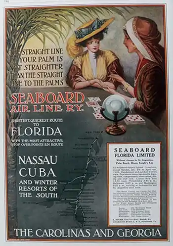 "The straight line of your palm is not straighter than the straight line to the palms": another advertisement for the Seaboard Air Line's "shortest, quickest route to Florida", 1908.