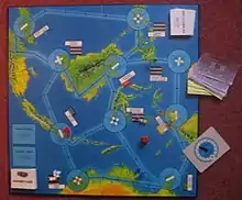 The board is marked up with airfields which are connected by air lanes. Airfields have runways, some with two at right angles to each other some with just one. Every airfield has a Control Area where the planes circle before landing. Four of the airfields, Manila, Makassar, Derby and the Palau Islands act as home airfields for the four players. Finally the airfield has a warehouse where the foodstuffs and machinery tokens (pyramids) are stored.