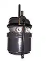An air brake or, more formally, a compressed-air-brake system, is a type of friction brake for vehicles in which compressed air pressing on a piston is used to both release the parking/emergency brakes in order to move the vehicle, and also to apply pressure to the brake pads or brake shoes to slow and stop the vehicle. Air brakes are used in large heavy vehicles, particularly those having multiple trailers which must be linked into the brake system, such as trucks, buses, trailers, and semi-trailers, in addition to their use in railroad trains. George Westinghouse first developed air brakes for use in railway service.[1] He patented a safer air brake on March 5, 1872.[2][3] Westinghouse made numerous alterations to improve his air pressured brake invention, which led to various forms of the automatic brake. In the early 20th century, after its advantages were proven in railway use, it was adopted by manufacturers of trucks and heavy road vehicles.