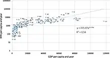 Demand for air travel across countries and population groups is "closely associated with affluence and lifestyle".[14] While "the share of passenger demand is substantially smaller in the Middle East (9%), Latin America and the Caribbean (5%) and Africa (2%), demand in those regions has been rapidly increasing, for example, growing by 234% in the Middle East between 2007 and 2019".[14] It has been estimated that around 90% of people have never flown and 1% of the current population is responsible for 50% of current emissions from flying.[42][71][72] It is estimated that, "at most, 11% of the global population flew in 2018, and only 2%–4% traveled between countries".[22] Total aviation demand in 2019 was almost 1 trillion ton-kilometer equivalent with 78% representing passenger flights and 22% freight.[14]