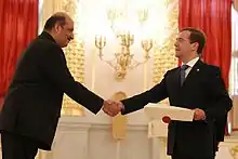 He was the Ambassador of India to Russia from 16 May 2011 – 30 November 2013.[17] His tenure saw the visit of Indian Prime Minister, Manmohan Singh in mid-December 2011 to Russia, and Russian President Dmitry Medvedev to India in March 2012 for the BRICS summit in New Delhi. It also saw visits to India in December 2012 by Russian President Vladimir Putin and to Russia by Indian Prime Minister Manmohan Singh in September 2013 for the G20 Summit in St. Petersburg and in November 2013 to Moscow for the annual India-Russia Bilateral Summit. The 65th anniversary of bilateral Indo-Russian diplomatic relations was marked with year-long celebrations during his tenure.[18] It also saw the induction of three Talwar-class frigates into the Indian Navy fleet, INS Teg, INS Tarkash, and INS Trikand,[19] as well as India's nuclear powered submarine INS Chakra (2011)[20] and aircraft carrier INS Vikramaditya.[21][22] INS Trikand was launched by his wife, Mrs. Ira Malhotra.[23] He retired on 30 November 2013.[24]