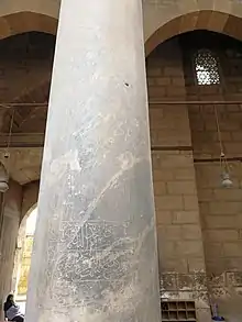 The walls of the mosque were constructed using limestone pillaged by the pyramids.[14] The ten red granite pillars in the mosque were also stolen goods.[15]