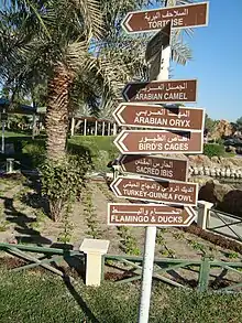 The park features 100,000 planted flora and trees, & more than 45 species of animals, 82 species of birds and 25 species of flora.[6] Species that roam the nature reserve section of the park include the Arabian oryx, which is extinct in the wild, South African cheetah, lion, Savannah monitor, African rock python, Persian gazelle, springbok, African wild dog, Spotted hyena, saluki dogs,[7] impala, fallow deer, Chapman's zebra, Honey badger and desert hares.[8] Arabian and North African species such as the scimitar-horned oryx, addax (which is rare in the wild), dama gazelle, giraffes, Nubian ibex, wild goat, barbary sheep and Asiatic onager are also present.[9] The park also employs a captive breeding policy of endangered species.[10]