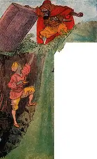 ![]() Depiction by British illustrator René Bull of Aladdin finding the magical lamp inside the cave, c. 1898 | |