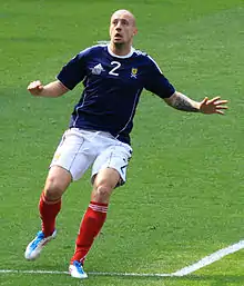 Along with his then-Rangers teammate Charlie Adam, Hutton was called up by manager Alex McLeish to the Scotland squad for the first time on 11 May 2007 for a friendly against Austria and a Euro 2008 qualifying match against the Faroe Islands.[56] He made his international debut against Austria on 30 May 2007, coming on as a substitute.[57] Hutton made his competitive debut against Lithuania in September 2007.[58] Hutton was part of the Scotland team that beat France at Parc des Princes in September 2007.[59]
