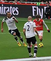 During the January transfer window in the 2007–08 season, Premier League side Tottenham Hotspur made a bid, believed to be in the £5 million region, for Hutton. He initially rejected the chance to join Spurs,[18] and did so again when they improved their offer.[19] The protracted transfer was finally completed on 30 January 2008, with the fee reported to be in the region of £9 million.[20][21] He made his Spurs debut on 2 February in a 1–1 draw with Manchester United.[22] Hutton was cup-tied for the remainder of Spurs' UEFA Cup campaign.[23] In just his third appearance for the club he played as Tottenham won the 2008 Football League Cup Final against Chelsea.[24]