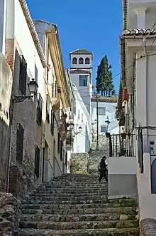 A new set of walls was constructed further north of the Albaicín during the 13th–14th centuries, with Bab Ilbirah (present-day Puerta de Elvira) as its western entrance.[14][16] Among the major monuments built in the Albaicín during this period are the Maristan (hospital), built in 1365–1367 (later demolished in 1843)[21] and the Great Mosque (congregational mosque) of the Albaicín, dating from the 13th century.[lower-alpha 1] During this time the commercial heart of the district was what is now known as Panaderos Street (Calle Panaderos). This street ran between the gate called Bab al-Ziyada to the west and the Great Mosque of the Albaicín to the east. Next to Bab al-Ziyada was a public square called Raḥbat al-Ziyāda ("Enlargement Square") also existed, later known in Spanish as El Ensanche ("the Enlargement") and now as Plaza Larga.[23]