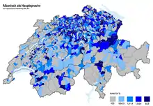 In Switzerland, no statistics have been collected so far on how many people call themselves Albanians. Based on the 2000 census, the number of Albanian speakers was estimated at 170,000. In 2012, there were 1302 people from Albania, 79,261 with Kosovar citizenship and 61,668 with Macedonian nationality, with neither all Kosovars nor all Macedonians being Albanians. The total number of people living in Switzerland Albanian descent of inclusive naturalized and dual citizens is currently estimated at about 200,000. 3.1% of the permanent population in Switzerland in 2016 stated that they use Albanian as the main language, which corresponds to 258,415. Thus, the Albanians belong together with the 316,525 Italians, the 303,525 Germans and the 268,660 Portuguese to the largest groups of foreigners in Switzerland.