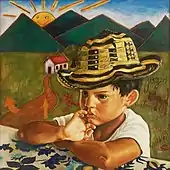 Gómez Gómez's first exhibition took place in 1979 at Casacoima in Guanare, capital of Portuguesa State in Venezuela in a group show along with other artists from the region. From 1975 to 1981, Gómez Gómez found work in Bogotá and in Venezuela as a freelance designer, typographer, illustrator and graphic artist for various small producers of wine, perfume, fashion products and the like, eventually working to produce massive photo-litho images. It was in this period that Gómez Gómez became interested in pursuing work in large murals. His first one-man show was held in 1981 at the Ateneo Popular in Guanare, Venezuela.[11] Goméz Goméz's first prominent mural was Caldas Tutelar, commissioned by the Consejo Superior (board of directors) of the Universidad Distrital of Bogotá, painted in 1987 (subsequently restored by the artist in 2013).[9] In 1981, Gómez Gómez returned to Bogotá where he accepted positions as Professor of Art History and fine art drawing for CIDCA (a regional college in Bogotá) for twelve years. Concurrently, he conducted classes and workshops at Universidad Pedagógica Nacional de Colombia in advanced color theory, textural representations in painting, anatomy and painting technique.[8] He subsequently spent most of 1996 at the Archivo General de la Nación (The National Archive of Colombia) in Bogotá, conducting research on the History of Art in Colombia. For the past few decades, he has lived between Orlando and Daytona Beach, in a largely rural section of Deltona, Florida. He has had exhibits in major cities worldwide. In March 2002, he concurrently presented his portrait of Florida's First Lady, Columba Bush; he was named Artist of the Month by The Orlando Museum of Art; and he was selected to receive the Simon Bolivar Prize as "Central Florida's Best Latin American Artist."[12]