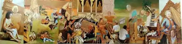 Gómez Gómez's work often typifies self-contradictory reference to the key subject matter; for example, the father referred to in a title may appear in the painting as a baby boy while his children are painted as elderly and doddering, or an otherwise sober and traditional old world square in a Latin American city may feature a gigantic iguana painted in a shallow depth of field, poised to leap off the canvas directly at the viewer. In his mural Sounds, Cuban Salsa legend Celia Cruz is accompanied by an anonymous bare-chested man drumming on a plastic bucket suggesting, in the words of El Nuevo Herald's Adriana Herrera, a "concert which would imply an impossible musical fusion, joining Beethoven's Ninth Symphony with Azúcar de la Guarachera of Cuba". This is a concert that Herrera calls a "riot of joy" which impossibly includes Louis Armstrong and Beethoven who seems to be listening intently to Pavarotti and Ray Charles.[15]