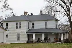 The Alden House is a historic house in a rural part of southern Bentonville, Arkansas. It stands in an agricultural area which lies on 0.75 miles (1.21 km) north and 0.4 miles (0.64 km) west of the community of Osage Mills. It is a 1+1⁄2-story wood-frame structure, most notable for a single-story porch, which wraps around three sides of the house. The main entrance is located in the beveled northwest corner of the building. The house, built in c. 1900 by the son of Philo Alden, a leading local farmer of the time, has a distinctive combination of Colonial Revival and Eastlake Victorian features.[2]