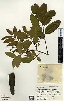 The fruit of this tree is usually eaten by possums and birds.[2] Some insects enjoy chewing the bark and the leaves.[6] In addition, the leaves on a small tītoki tree will be targeted by deer.[6]