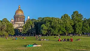 The Alexander Garden (Александровский сад) lies along the south and west façades of the Russian Admiralty in St. Petersburg, parallel to the Neva River and Admiralty Quay, extending from Palace Square in the east to St. Isaac's Cathedral in the west. The English park is named after Alexander II of Russia who ordered some 52 species of trees to be planted there.[1] It was formerly known as the Admiralty Boulevard, the Admiralty Meadow, and the Labourers Garden.