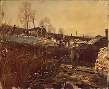 Although he volunteered to join the Army, he was assessed as unfit to fight. In 1917, his participation in the war was limited to a civilian job outside Reading, processing tens of thousands of Canadian horses en route to France — and often to death. Later, he was assigned to one of the horse remount depots on the Western Front.[7] Munnings's talent was employed as a war artist to the Canadian Cavalry Brigade, under the patronage of Max Aitken, in the latter part of the war. During the war he painted many scenes, including in 1918 a portrait of General Jack Seely mounted on his horse Warrior (now in the collection of the National Gallery of Canada, Ottawa).[8] Munnings worked on this canvas a few thousand yards from the German front lines. When General Seely's unit was forced into a hasty withdrawal, the artist discovered what it was like to come under shellfire.[9]