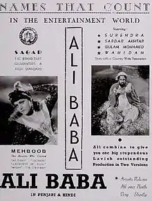 Alibaba is a 1940 Urdu/Hindi fantasy film directed by Mehboob Khan for Sagar Movietone.[1] The music was directed by Anil Biswas, with lyrics by Safdar Aah.[2] The film was a bilingual, made in Punjabi language as Alibaba at the same time.[3] It starred Surendra, Sardar Akhtar, Ghulam Mohammed and Wahidan Bai.[4]
