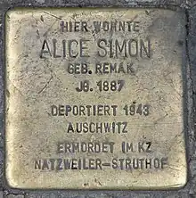 - ↑ "Alice Simon geb. Remak | Stolpersteine in Berlin". www.stolpersteine-berlin.de.