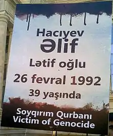 Alif Hajiyev was one of the Azeri combatants escorting hundreds of Azerbaijani civilians fleeing Khojaly. While crossing a road in groups, civilians were defended by Hajiyev who exchanged fire with Armenian troops. While covering the third group, Hajiyev was shot dead while changing magazines.[5] The bullet hit him in the head. Hajiyev was one of 40 defendants of the city which were stationed in Khojaly. Only 10 survived.[6] more than 200 Azerbaijani were killed during these events.[7] Hajiyev was buried in Martyrs' Lane, Baku.[4]