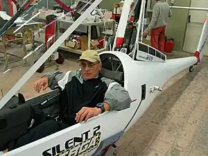 A Silent 2 Targa fuselage with a pilot trying out the cockpit | |
