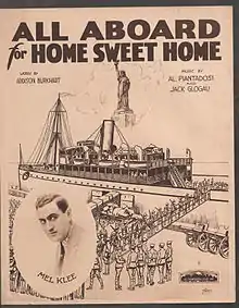 "All Aboard for Home Sweet Home" is a World War I era song released in 1918. The lyrics were written by Addison Burkhardt. Al Piantadosi and Jack Glogau composed the music. It was published by Al Piantadosi & Co., Inc. of New York, New York. Artist Starmer designed the sheet music cover. It features soldiers boarding a troop transport. The Statue of Liberty is above the ship. Various editions feature different artists within the inset photo including, the Courtney Sisters, Elsie White, Salvation Army nurses, and Mel Klee.[1]