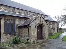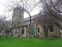The church has Anglo-Saxon and Norman remains. The chancel is the oldest remaining part being of 14th century origin. There is a south porch of 16th century origin. The church is of a perpendicular style; the tower of two stages with a large red clock face and a two light belfry window. The west face has a sculpture of the church's benefactor Sir Henry Vavasour.[1] The church is situated on ground raised from the road which is lawned and accommodated a small cemetery.