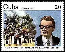 Two other stamps, both on the tenth anniversary of the coup, represent extreme reactions to the event. Scott Cuba #2605 shows the burning presidential palace of La Moneda ("The Mint") and a picture of Allende. The caption refers to him as having "fallen in combat".