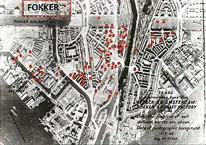 The Allied bombings of Amsterdam-Noord took place in July 1943 during the German occupation of the Netherlands in World War II. Three strategic bombing attacks by Allied Forces were aimed at the former Fokker Aircraft Factory in the northern part of Amsterdam, which was of interest as the factory was confiscated by the Nazis and employees were forced to produce aircraft for the Luftwaffe.[1][2][3] However, only 7 out of the 326 bombs from these three airstrikes hit their target, while the others fell on the surrounding residential area, resulting in the loss of more than 206 lives in total.[4][5][6][7][8] The attacks were the most damaging and deadly bombardment of Amsterdam during the Second World War,[9] and the most disastrous airstrike the city has ever endured. As these were Allied attacks, the losses and trauma caused by the event have always been a sensitive and painful topic for the citizens of Amsterdam-Noord.[2][4]