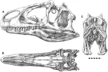 Inside the lacrimal bones were depressions that may have held glands, such as salt glands.[12] Within the maxillae were sinuses that were better developed than those of more basal theropods such as Ceratosaurus and Marshosaurus; they may have been related to the sense of smell, perhaps holding something like Jacobson's organs. The roof of the braincase was thin, perhaps to improve thermoregulation for the brain.[18] The skull and lower jaws had joints that permitted motion within these units. In the lower jaws, the bones of the front and back halves loosely articulated, permitting the jaws to bow outward and increasing the animal's gape.[103] The braincase and frontals may also have had a joint.[18]