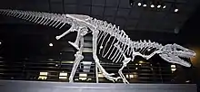 Allosauridae is one of four families in Allosauroidea; the other three are Neovenatoridae,[119] Carcharodontosauridae and Sinraptoridae.[44] Allosauridae has at times been proposed as ancestral to the Tyrannosauridae (which would make it paraphyletic), one example being Gregory S. Paul's Predatory Dinosaurs of the World,[120] but this has been rejected, with tyrannosaurids identified as members of a separate branch of theropods, the Coelurosauria.[121] Allosauridae is the smallest of the carnosaur families, with only Saurophaganax and a currently unnamed French allosauroid accepted as possible valid genera besides Allosaurus in the most recent review.[44] Another genus, Epanterias, is a potential valid member, but it and Saurophaganax may turn out to be large examples of Allosaurus.[31] Recent reviews have kept the genus Saurophaganax and included Epanterias with Allosaurus.[97][44]