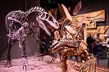 The skull had a pair of horns above and in front of the eyes. These horns were composed of extensions of the lacrimal bones,[18] and varied in shape and size. There were also lower paired ridges running along the top edges of the nasal bones that led into the horns.[18] The horns were probably covered in a keratin sheath and may have had a variety of functions, including acting as sunshades for the eyes,[18] being used for display, and being used in combat against other members of the same species[31][102] (although they were fragile).[18] There was a ridge along the back of the skull roof for muscle attachment, as is also seen in tyrannosaurids.[31]