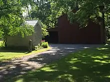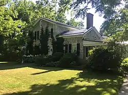 The house is prominent upon the west side New York State Route 90, with a 2021-posted historic marker honoring a John Irving who lived in the house 1907-13. Per the marker, he was a "schooner master and stonemason" who carved [quarried?] stone for early Cornell University buildings and the former Cornell library in Ithaca.[3]