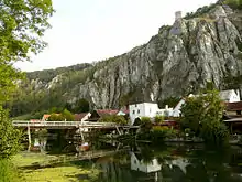 From Treuchtlingen the Altmühl flows in its lower course through the Franconian Jura plateau, in whose karst limestone it has dug a narrow valley. On the steep valley slopes here sometimes bizarre rock formations, for instance the cauldron shaped washouts near the village Eßlingen, about 20m above the river level.