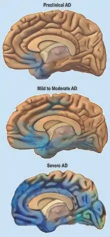 Alzheimer's disease is characterised by loss of neurons and synapses in the cerebral cortex and certain subcortical regions. This loss results in gross atrophy of the affected regions, including degeneration in the temporal lobe and parietal lobe, and parts of the frontal cortex and cingulate gyrus.[84] Degeneration is also present in brainstem nuclei particularly the locus coeruleus in the pons.[85] Studies using MRI and PET have documented reductions in the size of specific brain regions in people with Alzheimer's disease as they progressed from mild cognitive impairment to Alzheimer's disease, and in comparison with similar images from healthy older adults.[86][87]