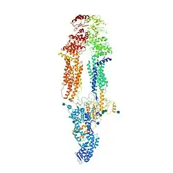 Presenilin 1 (PSEN1) is the catalytic subunit of the transmembrane protein complex gamma-secretase.[29][12] This protein cleaves amyloid precursor protein (APP), after beta-secretase cleavage, to produce Amyloid beta.[12][29] The gene for PSEN1 is located on chromosome 14, q24.2, and consists of 12 exons that encode a 467-amino-acid protein that is predicted to traverse the membrane 9 times.[12] Over 200 pathogenic mutations of this protein exist, many of which account for 18% to 50% of autosomal dominant EOAD cases.[15][12][30] PSEN1 mutations increase the risk of developing AD by increasing the production of amyloid beta-42, compared to amyloid beta-40.[12] Unlike APOE4, PSEN1 mutations tend to have a clear pathological effect in Hispanics and Latinos and tend to express region-specific mutations.[10] Puerto Ricans have a G206A mutation that causes familial AD, Cuban families diagnosed with EAOD commonly exhibit a L174M, mutation, Mexican families exhibit L171P and A431E mutations, and Colombian families exhibit an E280A mutation (particularly in the municipality of Yarumal).[10][31]