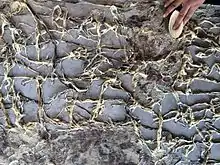 Wooden boards are sized to the paper being made. They are rubbed with soap so that the fibers do not stick. The fibers are arranged on wooden boards and beaten together into a thin flat mass. The best paper is made with long fibers arranged in a grid pattern to fit the board. Lesser quality paper is made from short masses arranged more haphazardly, but still beaten to the same effect.[69] This maceration process liberates soluble carbohydrates that are in the cavities of the cell fibers and act as a kind of glue. The Ficus tree bark contains a high quantity of this substance allowing to make for firm but flexible paper.[59] During the process, the stones are kept moist to keep the paper from sticking to it. The finished flat mass is then usually smoothed over with rounded orange peels. If there are any gaps after the maceration process, these are usually filled in by gluing small pieces of paper.[70]