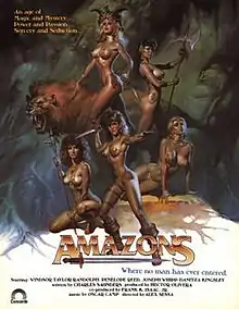 Amazons is a 1986 Argentine-American fantasy adventure film directed by Alejandro Sessa and starring Penelope Reed, Danitza Kingsley, Joseph Whipp, Ty Randolph, and Jacques Arndt. The screenplay was written by Charles R. Saunders, based on his short story Agbewe’s Sword, which first appeared in the 1979 anthology Amazons![1] The short story is included as part of the series Dossouye, about the real-life female warriors of the West African Kingdom of Dahomey, gathered together in a novel published by Saunders in 2008.[2]