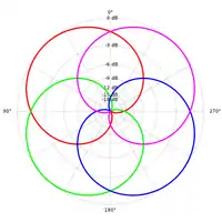 Being omnidirectional, the channel always gets the same constant input signal, regardless of the angles. So that it has more-or-less the same average energy as the other channels, W is attenuated by about 3 dB (precisely, divided by the square root of two).[2] The terms for actually produce the polar patterns of figure-of-eight microphones (see illustration on the right, second row). We take their value at and , and multiply the result with the input signal. The result is that the input ends up in all components exactly as loud as the corresponding microphone would have picked it up.