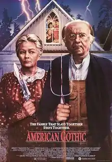 American Gothic is a 1988 slasher film directed by John Hough and starring Rod Steiger, Yvonne De Carlo, Janet Wright, and Michael J. Pollard. Its plot follows a group of travelers who become stranded on an island where they find themselves in the clutches of a demented family of murderers. The film poster is a pastiche of the Grant Wood painting of the same name.[6]